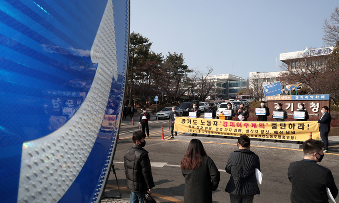 22일 경기도공공기관노동조합총연맹과 민주노총 전국사무금융서비스노동조합 소속 10여명은 도청 앞에서 기자회견을 열어 “지역 균형 발전 사업의 취지는 이해하지만 이번 공공기관 이전 계획은 또 다른 ‘특별희생자’인 직원들에게 어떠한 사전 협의도 없이 일방적으로 공표됐다”고 반발했다.