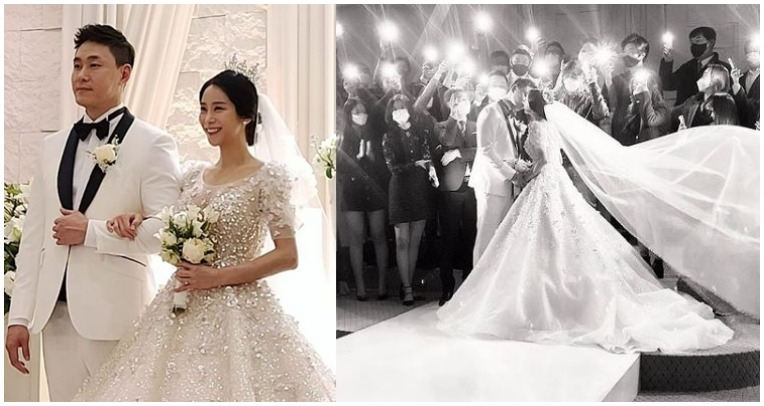 걸그룹 쥬얼리 출신 조민아(36·왼쪽 사진 오른쪽)가 임신 6개월에 결혼식을 진행했다.