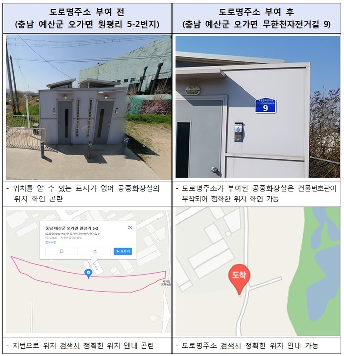 예컨대 도로명주소가 부여되기 전 충남 예산군 오가면 무한천자전거길 공중화장실은 ‘원평리 5-2번지’로만 표현돼 정확한 위치 확인이 곤란했지만 ‘무한천자전거길 9’라는 도로명주소가 부여된 뒤엔 내비게이션의 정확한 위치 안내와 건물번호판 부착으로 위치 확인이 가능해졌다.