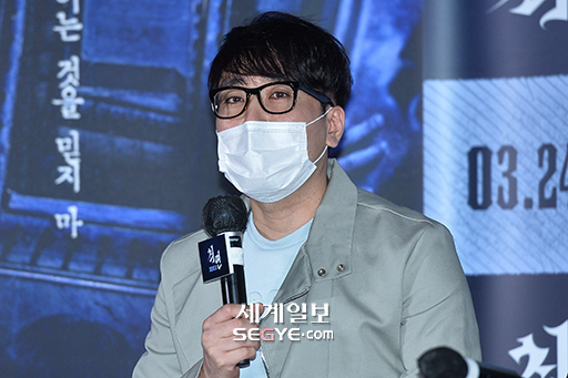 최재훈 감독이 16일 오후 서울 롯데시네마 건대점에서 열린 영화 ’최면’의 언론시사회에 참석해 취재진의 질문에 답하고 있다.