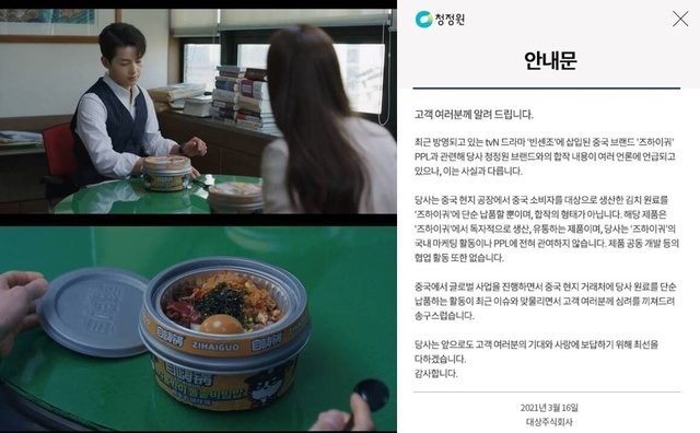 한편 대상 청정원은 tvN 주말극 '빈센조'에 간접광고(PPL)로 등장한 중국기업 '즈하이궈' 비빔밥 합작 의혹에 선을 그었다. 청정원은 지난 16일 홈페이지를 통해 "중국 내 자사 공장에서 현지 소비자를 대상으로 생산한 김치 원료를 즈하이궈에 단순 납품할 뿐"이라며 "합작 형태가 아니다. 해당 제품은 즈하이궈가 독자적으로 생산·유통하고 있다. 당사는 즈하이궈의 국내 마케팅 활동이나 PPL에 관여하지 않는다. 제품 공동 개발 등 협업 활동도 없다"고 해명했다. "중국에서 글로벌 사업을 진행하며 현지 거래처에서 당사 원료를 단순 납품하는 활동이 최근 이슈와 맞물렸다. 고객에게 심려를 끼쳐 송구스럽다. 앞으로도 기대와 사랑에 보답하기 위해 최선을 다하겠다"고 약속했다.