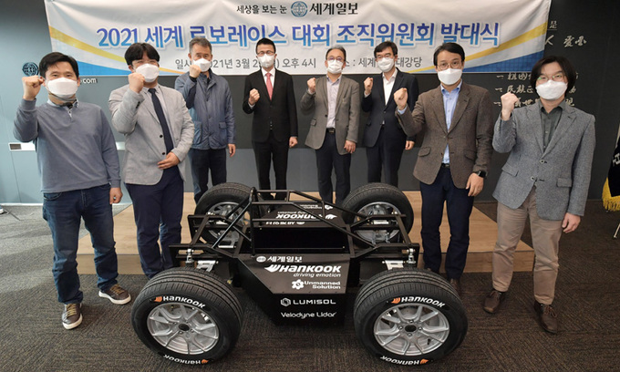 29일 서울 용산구 세계일보 본사 대강당에서 열린 ‘2021 세계 로보레이스 대회’ 조직위원회 발대식에서 정희택 세계일보 사장 등 참석자들이 기념촬영을 하고 있다. 왼쪽부터 조정산 한국생산기술연구원 박사, 문희창 언맨드솔루션 CTO, 장성국 한라대학교 교수, 정 사장, 김학진 서울대학교 교수, 조영훈 한국로봇산업협회 이사, 민정탁 한국로봇융합연구원 본부장, 유원상 선문대학교 교수.