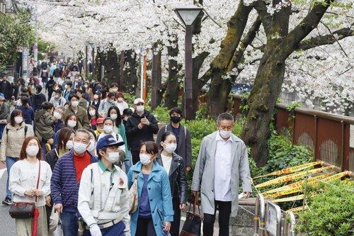 (도쿄 교도=연합뉴스) 일본에서 코로나19 확산 속도가 다시 빨라지는 가운데 지난 28일 도쿄도 메구로(目黑)구에서 나들이객들이 벚꽃이 만개한 거리를 걷고 있다. photo@yna.co.kr