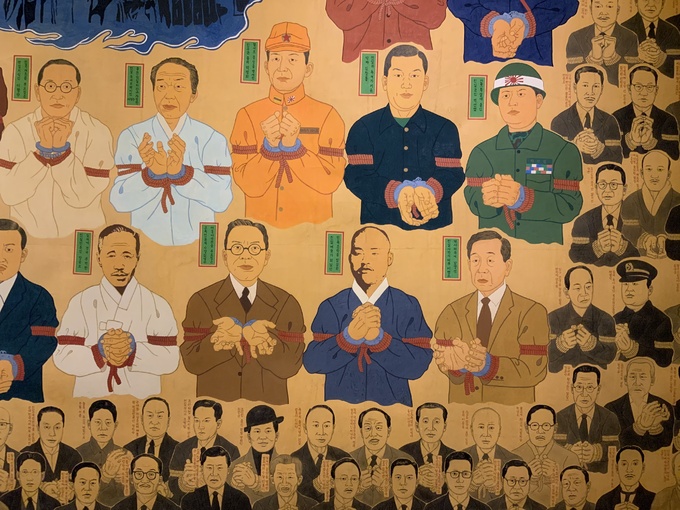 31일 광주비엔날레 전시관에 걸린 해당 작품은 70여년 전 반민특위 해체로 심판받지 못한 친일파들을 심판하고자 하는 마음을 담았다. 친일파 92명을 일일이 포승줄로 묶고 수갑을 채웠으며 각 인물 옆에 죄악상을 적어넣어 역사적, 예술적 단죄를 시도한 작품이다. 민족 고유의 조선 시대 전통 초상화 기법으로 인물 색에 덧칠을 반복해 표현했다.