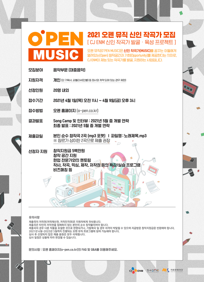 남궁종 CJ ENM 오펜팀장은 “끊임없이 변화하는 K팝 트렌드에 따라 신선하고 독창적인 음악을 찾는 수요는 늘고 있지만 높은 데뷔 장벽과 불안정한 창작 환경으로 신인 작곡가들이 메이저 무대로 진출하기는 쉽지 않다”며 “‘오펜 뮤직’은 재능 있는 신인 작곡가들에게 데뷔 기회를 제공하고 다양한 음악 장르를 개척하는 등 대중음악 발전의 밑거름이 되는 데 의미가 있다”고 말했다.