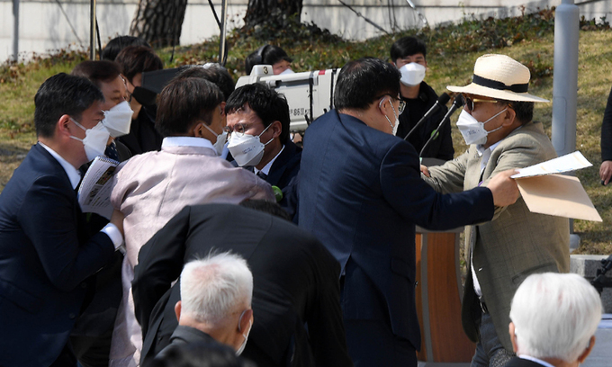 그제 열린 제102주년 대한민국 임시정부 수립 기념식 도중 김원웅 광복회장이 독립유공자 후손에게 멱살을 잡히는 소동이 벌어졌다. 기념공연이 시작된 뒤 대한민국 임시의정원 의장을 지낸 김붕준 선생의 손자이자 광복회원인 김임용씨가 김 회장에게 다가가 멱살을 잡고 여러 차례 흔들었고, 황기철 보훈처장 등이 말려 상황이 끝났다고 한다. 김씨는 “김 회장이 사익을 위해 광복회를 정치적으로 이용하고, 광복회원들의 명예를 크게 실추시킨 데 분노한 것”이라며 “형사 고발을 각오하고 한 일”이라고 했다. “할머니가 만든 임시의정원 태극기를 김 회장이 마음대로 복제해 정치인들을 만나는 자리에서 이용했다”는 불만도 토로했다.