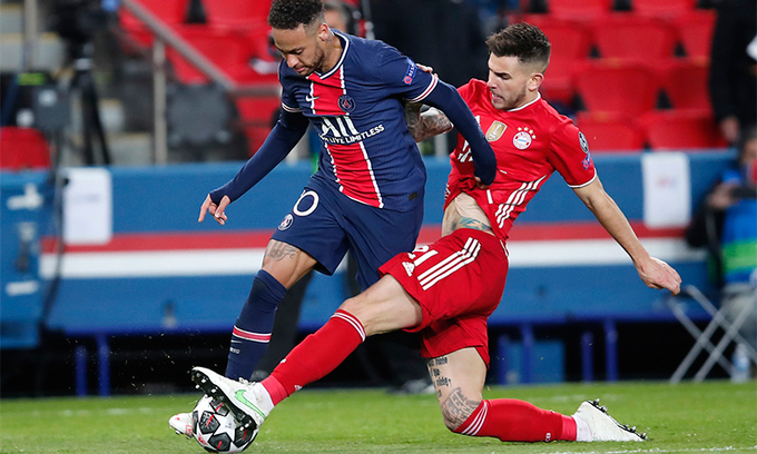 PSG 공격수 네이마르(왼쪽)가 14일 프랑스 파리 파르크 데 프랭스에서 열린 뮌헨과의 2020∼2021 UCL 8강 2차전에서 상대 수비의 견제를 뚫고 드리블하고 있다. 파리=AP연합뉴스