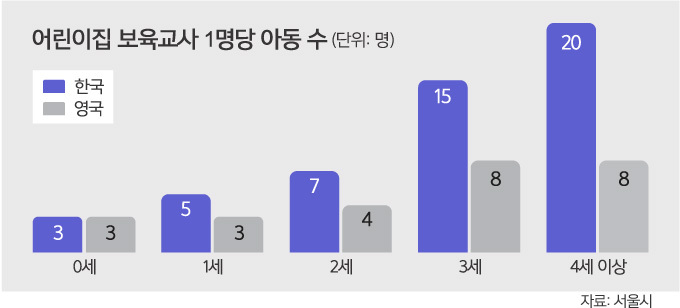 시가 지난해 ‘국공립어린이집 질 개선 연구’를 실시한 결과 보육교사 80.1%는 보육의 질과 노동환경 개선을 위해 가장 필요한 요소로 ‘교사 대 아동 비율 축소’를 꼽았다. 지난해 10월 청와대 국민청원 게시판에는 ‘교사 대 아동 비율 개정’을 요구하는 청원이 올라 20만여명으로부터 동의를 받기도 했다.