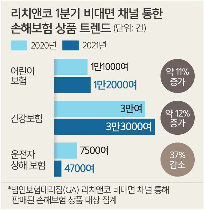 26일 법인보험대리점(GA) 리치앤코가 자사 비대면 보험 매니저가 1분기 동안 판매한 5만1000여개의 손해보험 상품을 분석한 결과 어린이보험은 총 판매 상품의 22.6%에 해당하는 총 1만2154건의 계약 건수를 기록하며 전년 동기 대비 약 11% 이상 판매가 늘었다.
