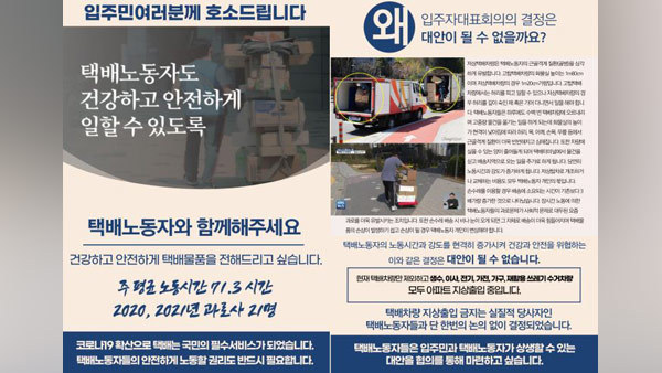 택배 갈등이 빚어지고 있는 서울 강동구 고덕동 아파트 측이 집 앞에 인쇄물을 붙인 택배기사 2명을 신고한 것과 관련해 전국택배노동조합(택배노조)은 "너무한 처사"라고 비판했다.