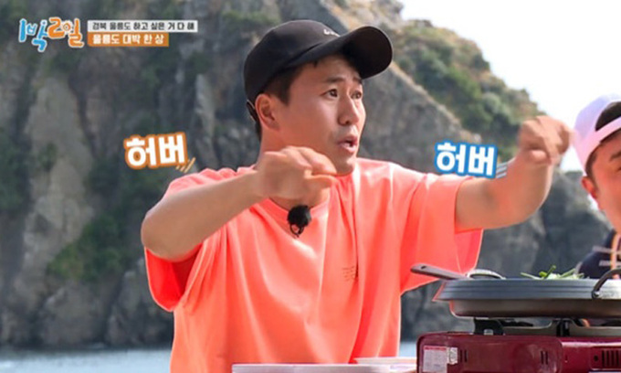 KBS2 ‘1박2일’은 지난해 7월 방송됐던 장면이 갑자기 도마에 올랐다. 일부 네티즌이 경북 울릉도 편 식사 장면에서 김종민이 식사를 하던 중 갈매기가 날아들자 손을 내젓는 장면(사진)에 ‘허버허버’라는 자막이 들어간 것에 대한 문제 제기를 한 것이다. ‘허버허버’는 급하게 식사하는 남성을 비하하는 남혐 용어로 사용된다. 라비를 꼭두각시처럼 조종하는 모습을 표현하기 위해 그린 손가락 모양도 논란이 됐다. GS25 광고에서 나타났듯 이런 손가락 모양이 남성의 주요 신체부위를 비하하는 손동작이라는 지적이다.