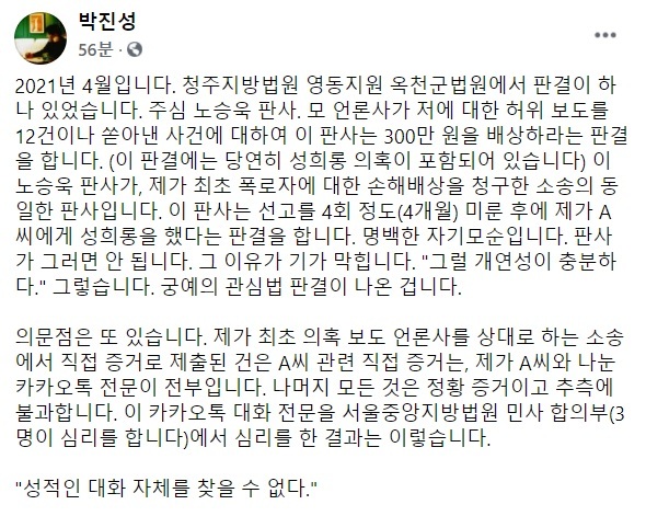 박씨는 이날 오후 페이스북 등에 글을 올려 “2021년 4월, 청주지방법원 영동지원에서 판결이 하나 있었다”며 “모 언론사가 저에 대한 허위 보도를 12건이나 쏟아낸 사건에, 한 판사가 (언론사가 제게) 300만원을 배상하라는 판결을 했다”고 적었다.