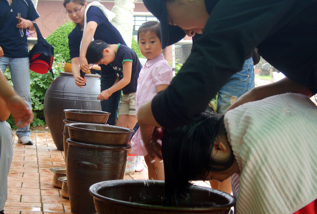 2시간 동안 열리는 민속놀이 체험에선 옛 여인의 아름다운 가체(加髢)와 전통의상을 입고 단오 풍경이 그려진 대형 걸개그림을 배경 삼아 기념촬영을 한다. 가마솥에 창포를 삶아 만든 창포탕(菖蒲湯)에 머리(사진)를 감는 체험도 한다.