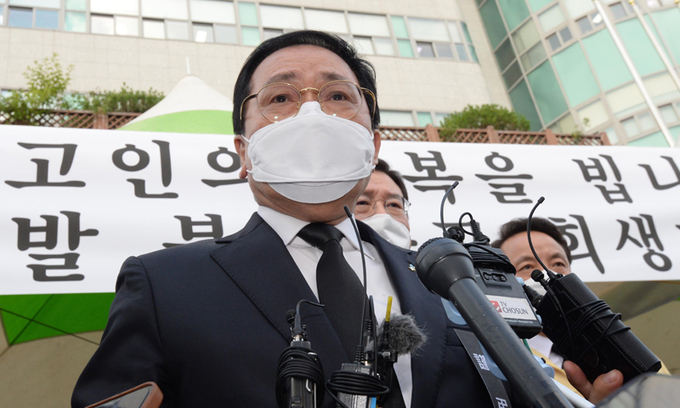 11일 광주 동구청 주차장에 마련된 합동분향소를 찾은 유영민 대통령 비서실장은 조문한 뒤 기자들을 만나 문 대통령의 메시지를 전했다.