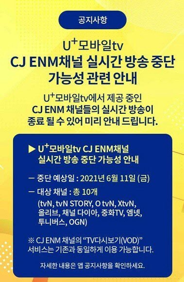 13일 관련 업계에 따르면 전날 밤 12시부터 LG유플러스의 U+모바일tv에서 CJ ENM 채널 10개의 실시간 방송의 송출이 중단됐다. tvN, tvN 스토리, O tvN, 올리브, 엠넷, 투니버스 등 10개 채널이다.