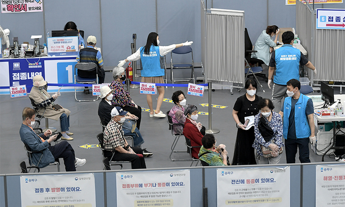 15일 서울 송파구 거여동 송파체육문화회관 코로나19 예방접종센터를 찾은 시민들이 백신을 맞기 위해 대기하고 있다. 하상윤 기자