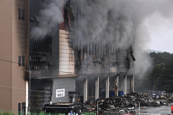 물류센터 건물을 소방차 20여 대가 둘러싼 채 소방차 방수포에서 나온 물줄기가 이틀째 건물 내부로 쏟아졌지만 아직 불길은 잡히지 않았다.