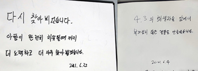 이 대표는 23일 당대표 당선 이후 처음 제주를 방문한 자리에서 제주4·3평화공원을 찾아 희생자의 넋을 기렸다. 이 대표는 위패봉안실에 마련된 방명록에 “다시 찾아뵈었습니다. 아픔이 완전히 치유될때까지 더 노력하고 더 자주 찾아뵙겠습니다”라고 썼다.