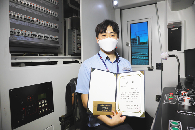 공항철도 2021년 ‘최고의 목소리’ 주인공으로 뽑힌 이재훈 기관사가 최우수상장을 들어보이며 포즈를 취하고 있는 모습.
