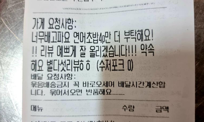 실제로 그가 공개한 영수증 사진 속 가게 요청사항란에는 ‘너무 배고파요 연어 초밥 4p만 더 부탁해요! 리뷰 예쁘게 잘 올리겠습니다. 약속해요 별 다섯 개 리뷰’라고 적혀있다.