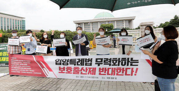 ‘입양의 공공성 강화와 진실규명을 위한 연대회의’(입양연대회의)와 ‘한국미혼모가족협회’ 등 입양 관련 시민단체들은 7일 서울 여의도 국회 앞에서 기자회견을 열어 “보호출산제가 친생부모의 출생등록을 규정한 입양특례법의 취지를 무력화시킬 수 있다”고 반발했다.
