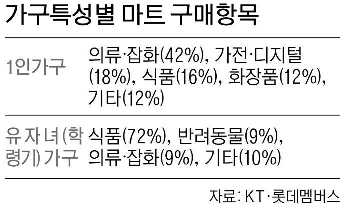 대형마트 이용자 중 자녀가 있는 가구는 식품을, 1인가구는 의류나 가전제품을 주로 구매한다는 분석 결과가 나왔다. 마트에서 가장 많은 돈을 쓰는 연령대는 30대로 이들은 주로 유아동 의류와 완구 구매 비중이 높았다.