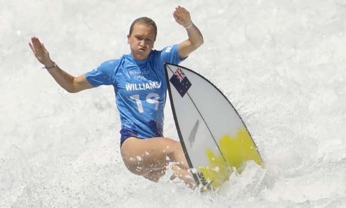 뉴질랜드 엘라 윌리엄스가 25일 열린 도쿄올림픽 서핑 여자부 1라운드 경기에서 파도를 타고 있다. 도쿄=AP연합뉴스