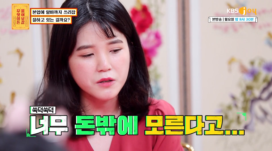 26일 방송된 KBS Joy 예능 ‘무엇이든 물어보살’에는 쓰리잡을 뛰고 있다는 25세 의뢰인이 출연했다.