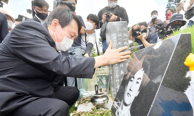 대선 예비후보인 윤석열 전 검찰총장이 지난 17일 오전 광주 북구 5·18 구묘역(민족민주열사묘역)에서 이한열 열사의 묘소를 참배하고 있다. 광주=연합뉴스
