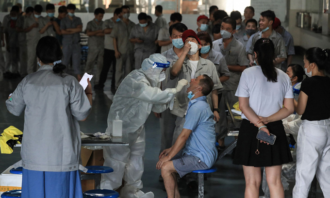 신종 코로나바이러스 감염증(코로나19) 기원지 논란을 빚는 중국 후베이성 우한의 한 자동차 부품 생산공장에서 4일 직원들이 코로나19 핵산검사를 받고 있다. 우한=AFP연합뉴스