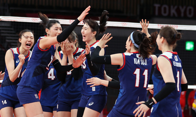 대한민국 선수들이 지난 4일 오전 일본 도쿄 아리아케 아레나에서 열린 도쿄올림픽 여자배구 8강전 대한민국과 터키의 경기에서 승리하며 4강행을 확정 지은 뒤 기뻐하고 있다.   뉴시스