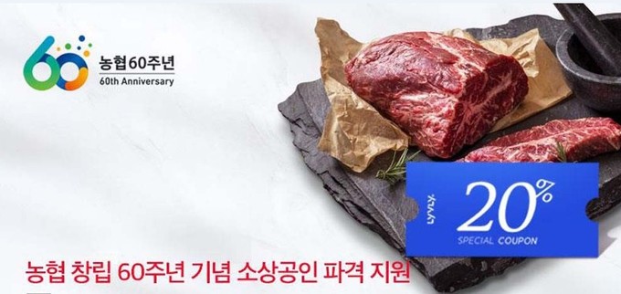 농협(회장 이성희)은 창립 60주년을 맞이하여 정육점 및 식당 등 축산물 관련 소상공인을 위한 할인행사를 농협 라이블리 사업자몰에서 오는 22일까지 2주간 실시한다.