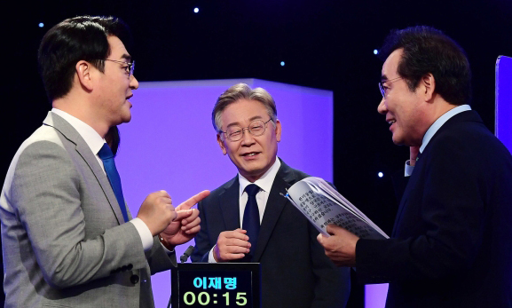 박용진(왼쪽부터), 이재명, 이낙연 더불어민주당 대선 경선 후보가 11일 오후 서울 여의도 KBS에서 열린 대선 후보자 토론회에 참석해 인사를 나누고 있다. 뉴스1