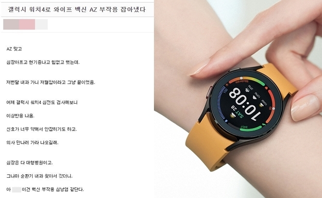 지난 19일 온라인 커뮤니티 ‘에펨코리아’에는 ‘갤럭시 워치4로 와이프 백신 AZ 부작용 잡아냈다’라는 제목의 글이 게재됐다.