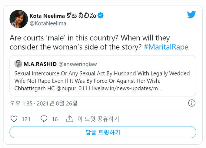 닐리마 박사는 “희망은 사법부에 있다”며 “몇몇 판례가 작은 승리를 안겨주고 있긴 하지만, 부부 강간죄 성립의 장벽은 여전히 높다”고 설명했다. 이어 강간 예외 조항에 부부 관계를 포함하는 현재 형법은 여성 인권 신장을 가로막고 있다고 꼬집었다. 그는 ”인도에서 강간이 범죄인 이유는 여성 인권을 유린해서가 아니라 여성을 다른 남성의 재산으로 여기기 때문”이라며 “인도가 영국으로부터 독립하면서 인도 국민이 자유로워졌지만, 남성이 아닌 절반의 국민(여성)은 아직도 자유롭지 못하다”고 덧붙였다.