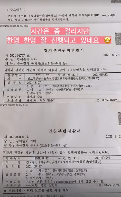 한예슬은 “시간은 좀 걸리지만 한 명, 한 명 잘 진행되고 있다”며 경찰서에서 발부된 수사 결과 통지서를 담은 사진을 올렸다.