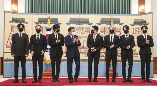 文 대통령, BTS 특사 임명 입력 : 2021-09-14 23:08:14 수정 : 2021-09-14 23:08:13 청와대사진기자단 구글 네이버 유튜브 문재인 대통령이 14일 청와대 본관에서 ‘미래 세대와 문화를 위한 대통령 특별사절’로 임명한 그룹 BTS 멤버들과 기념촬영을 하며 박수를 치고 있다. 왼쪽부터 뷔, 제이홉, 진, 문 대통령, RM, 슈가, 지민, 정국. - 기자 Copyright ⓒ 세계일보. 무단 전재 및 재배포 금지 세계일보 -