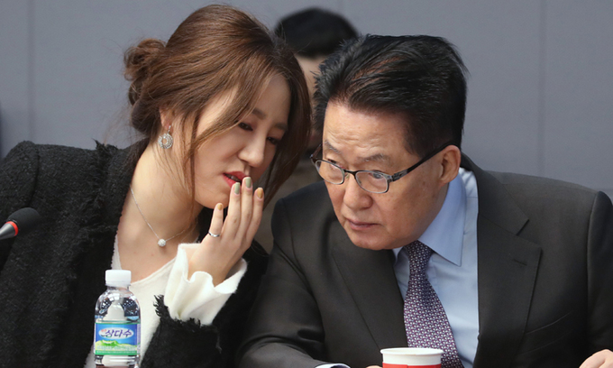 지난 2018년 1월 12일 서울 여의도 국회 의원회관에서 열린 국민의당지키기운동본부 전체회의에서 박지원 국민의당 전 대표(현 국가정보원장)와 조성은 전 미래통합당 선대위원회 부위원장이 대화를 하고 있는 모습. 뉴스1