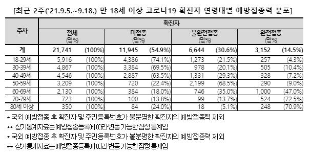 25일 중앙방역대책본부(방대본)에 따르면 최근 2주간(9.5∼18) 나온 만 18세 이상 확진자 2만1천741명 가운데 85.5%는 백신 미접종자(1만1천945명·54.9%) 또는 불완전 접종자(6천644명·30.6%)였다.