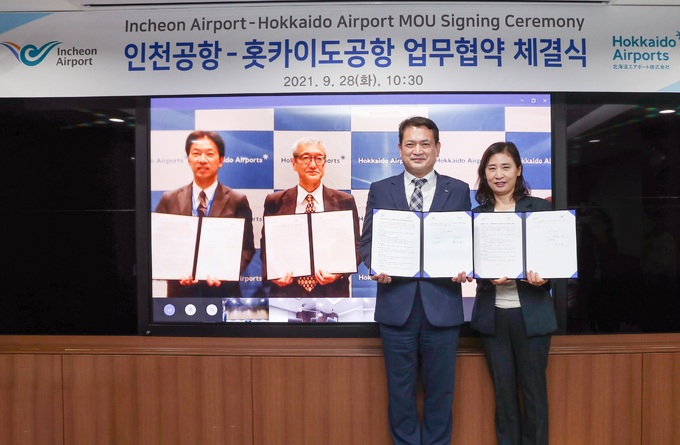 인천국제공항공사는 포스트코로나 대비 항공노선의 조속한 운항 재개를 촉진하기 위해 28일 공사 회의실에서 일본 홋카이도공항과 ‘인천∼홋카이도 노선 이용촉진 등을 위한 업무 협약(MOU)’을 체결했다. 이날 행사는 비대면 화상회의로 진행됐다.