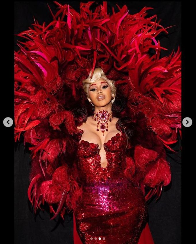 이날 카디비는 뮈글러의 레드 컬러 글리터 드레스와 함께 한껏 과장된 깃털 장식과 망토를 착용해 압도적인 비주얼을 뽐냈다. 특히 그는 볼륨감 넘치는 몸매와 금발 머리를 연출해 대세 스타일 아이콘으로서의 면모도 과시했다.