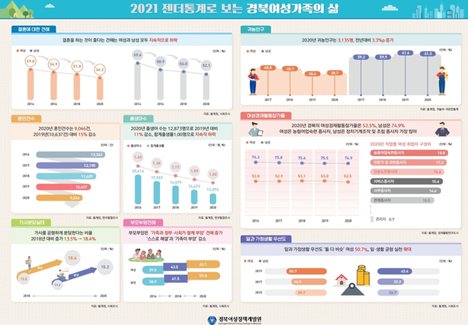 이 같은 내용은 경북여성정책개발원이 발간한 ‘2021 통계로 보는 경북여성가족의 삶’이란 책 속에 담겼다. 이 책에는 경북 여성의 사회적 지위와 귀농인구 등 7대 영역 48개 지표로 집계한 통계가 실렸다.