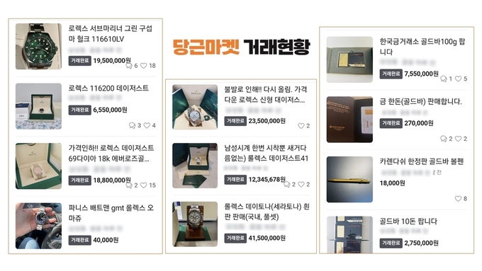 최근 중고거래가 활발해지면서 수천만원을 호가하는 고급 시계와 골드바 등도 당근마켓, 중고나라, 번개장터 같은 중고 거래 플랫폼에 등장하고 있다.