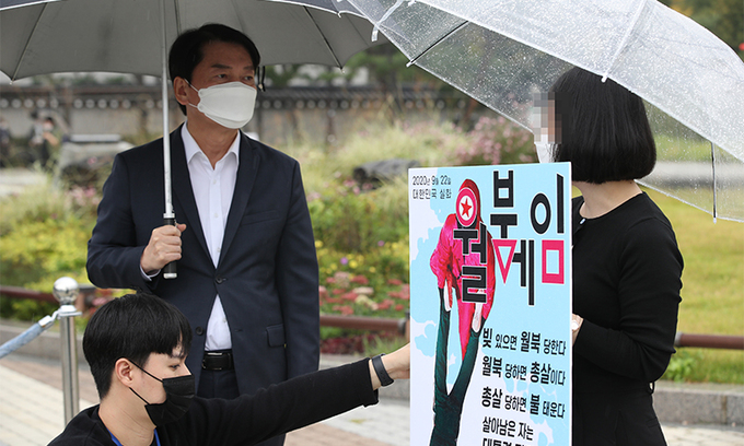지난해 9월 서해상에서 북한군 총격에 숨진 해양수산부 공무원 이모씨의 유족이 8일 청와대 앞에서 1인 시위를 하며 문재인 대통령을 향해 "지금이라도 함께하겠다는 약속을 지켜달라"고 요청했다.