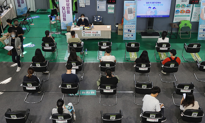 14일 서울 서대문구 예방접종센터를 찾은 시민이 예방접종 후 경과를 모니터링하고 있다. 뉴시스