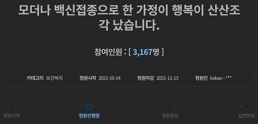 15일 청와대 국민청원 게시판을 보면 ‘화이자 백신 접종으로 한 가정이 행복이 산산조각 났습니다’라는 제목의 글이 게재됐다.