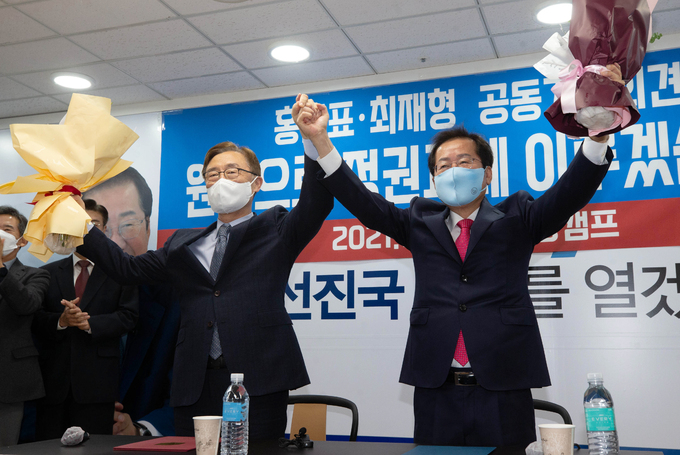 최 전 원장은 홍 의원을 지지한 이유에 대해 “본선에서 여당 후보를 이길 수 있는 후보가 우리 당 후보가 돼야 하는 것이 첫 번째 선결 조건”이라며 “안정적이고 도덕적인 면에서, 확장성 면에서 국민 지지를 가장 많이 받을 분을 돕는 게 정치 교체, 정권 교체에 대한 국민 열망에 부흥한다는 뜻에서 (홍 의원을) 지지하기로 결심했다”고 전했다.