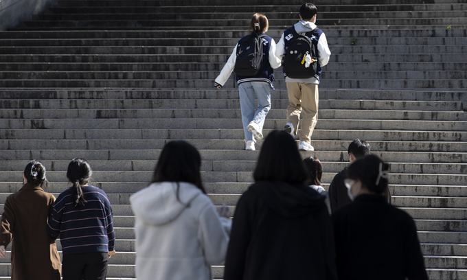 서울대가 대면 수업 기조로 전환한 첫날인 18일 학생들이 계단을 오르고 있다. 연합뉴스