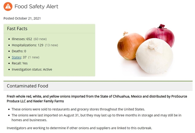 미국 식품의약청(FDA)과 연방질병통제예방센터(CDC)는 21일(이하 현지시간) 자체 웹사이트를 통해 최근 미 전역에서 확산 중인 살모넬라균 감염 사태와 관련, 매개체로 드러난 대량의 멕시코산 생 양파를 리콜 조치했다고 알렸다. 정확한 리콜 물량은 공개되지 않았다.
