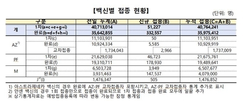 전날 신규로 접종을 완료한 사람은 33만2천557명이다. 백신 종류별로 보면 화이자 18만1천896명, 모더나 14만7천537명, 아스트라제네카(AZ) 2천619명이다.
